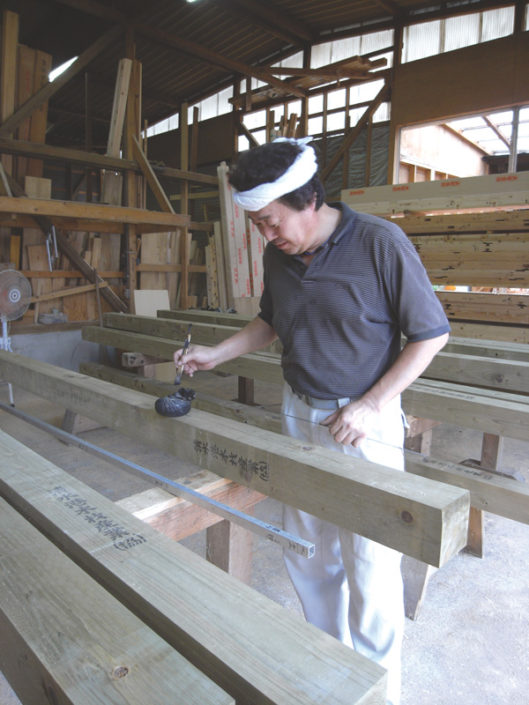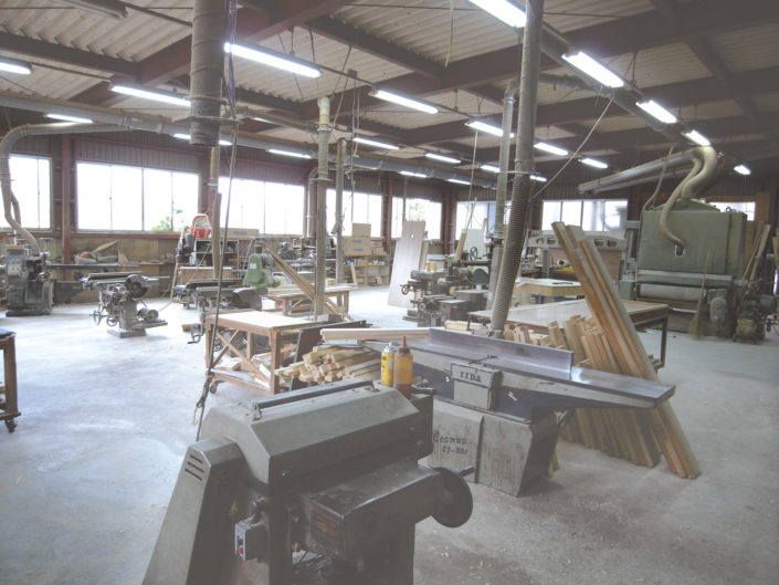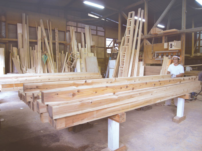 材木屋さんや建材屋さんからから材木等の資材を直接仕入れ、保管し加工するのがアトリエです。大工さんが木拾いし、選り分け加工する一連の作業場のことを言います。ここでは墨付・刻みの上棟前の作業から枠材・造作材の加工を含め、テーブル等の作成まで全て行います。