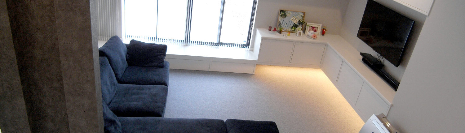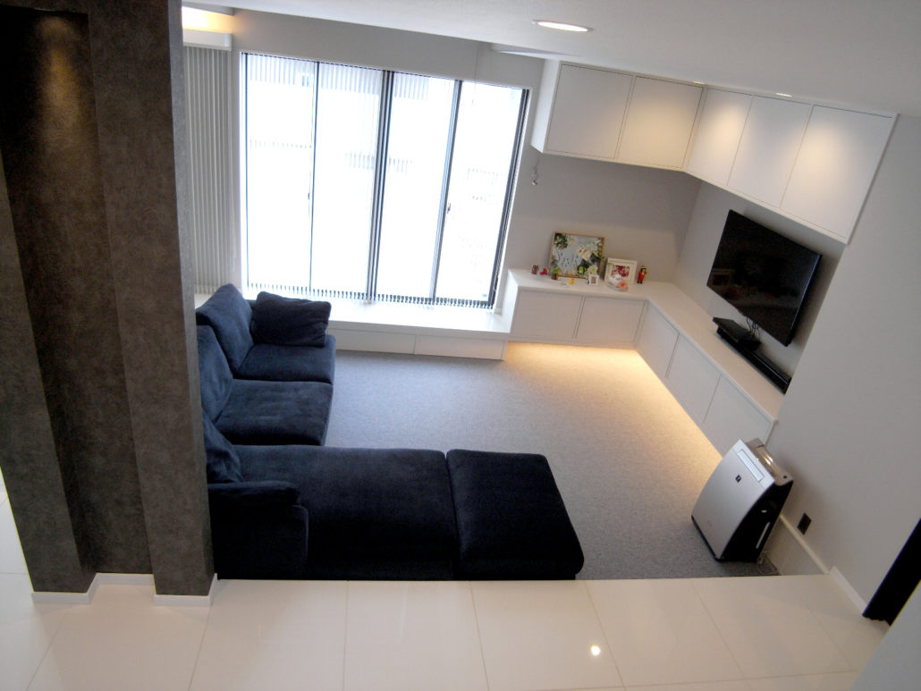 30帖大のLDKを照らす照明は間接照明とすることで柔らかな落ち着きと安らぎを演出しています。写真では伝わりませんが、夜間はこの間接照明で十分明るいそう。リビングボードの下も間接照明にすることでとっても雰囲気があります。