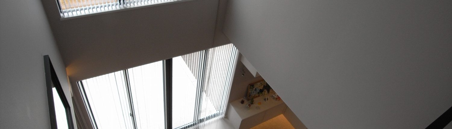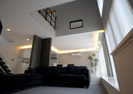 リビングスペースは1段下げて、リビング上部に吹き抜けがあり、間接照明をぐっると廻す、そんなイメージをカタチにしました。