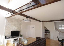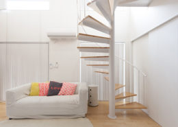 踏み板とケラバ板の色をモノトーンで分けたことで存在感を出しています。鉄骨製と木製と悩みましたがここは木製で大正解。色づけが可能になったことでいいアクセントとなっています。