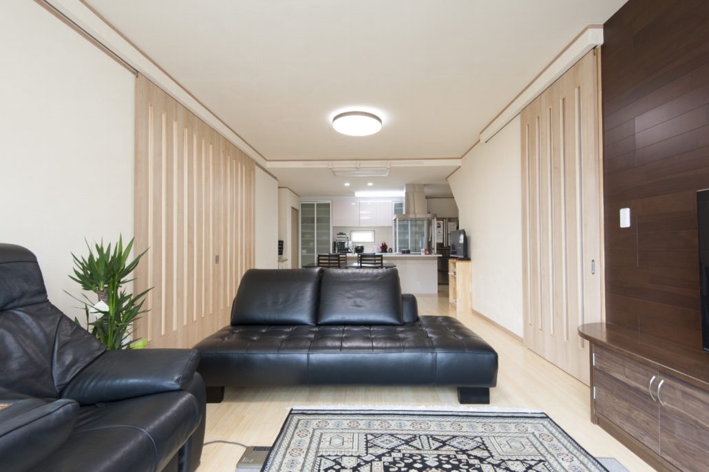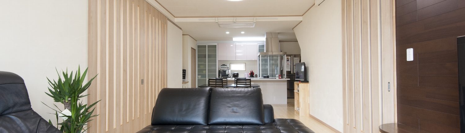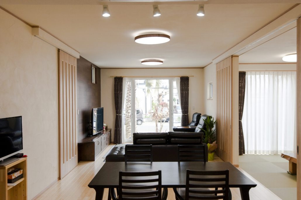 野球の関係で大人数が集まるというA様。リビングとダイニング、そしてフルオーダーだから可能な大開口が出来る両引戸を設えた9帖の和室で大空間となりました。